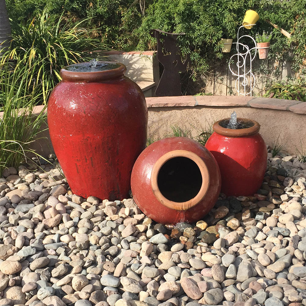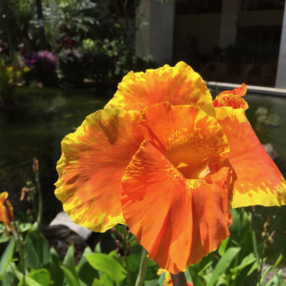 Green, Large Leaves, Shiny Foliage, Yellow, Red, Orange, Bamboo accents, Water features