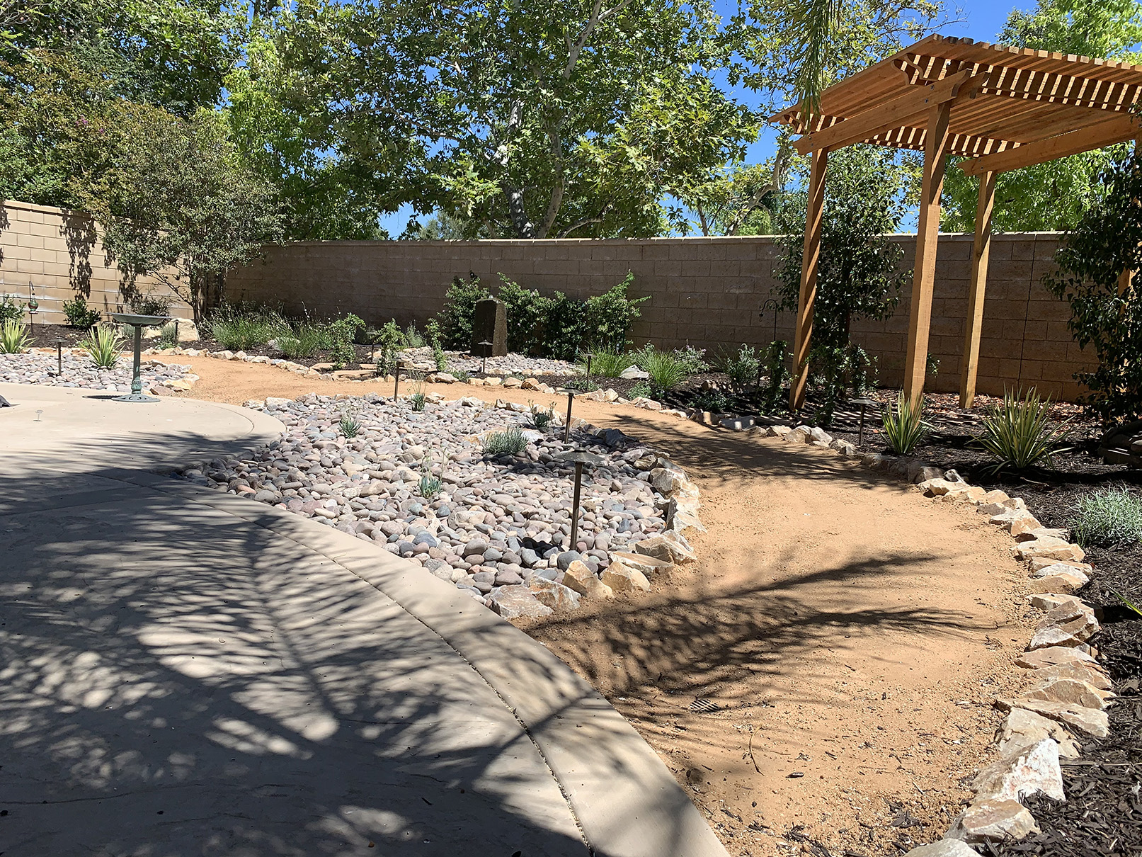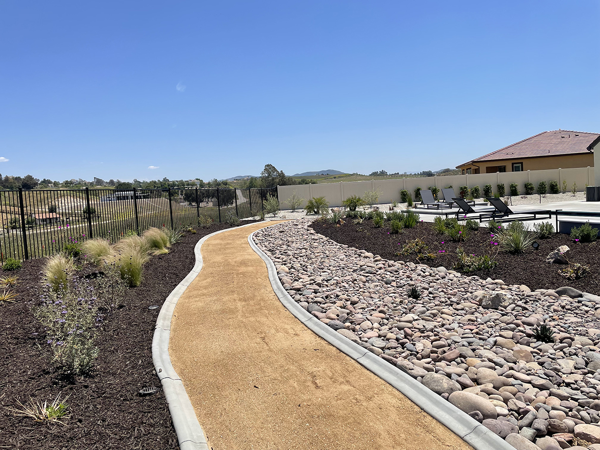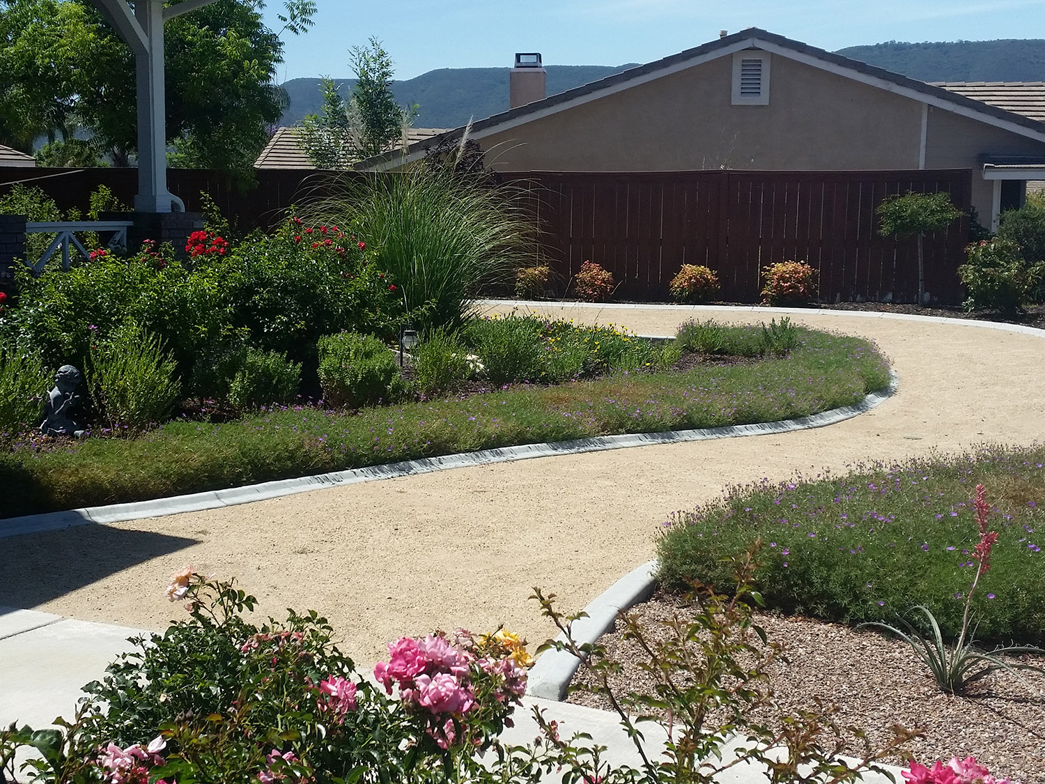Decomposed Granite – also known as DG – is a versatile landscape material. Its relatively low cost makes it an excellent material for walking paths, bike tracks, and secondary sitting areas. Its neutral color makes it an excellent fit for Mediterranean, Farmhouse, Wine Country, Desert and other landscape styles.