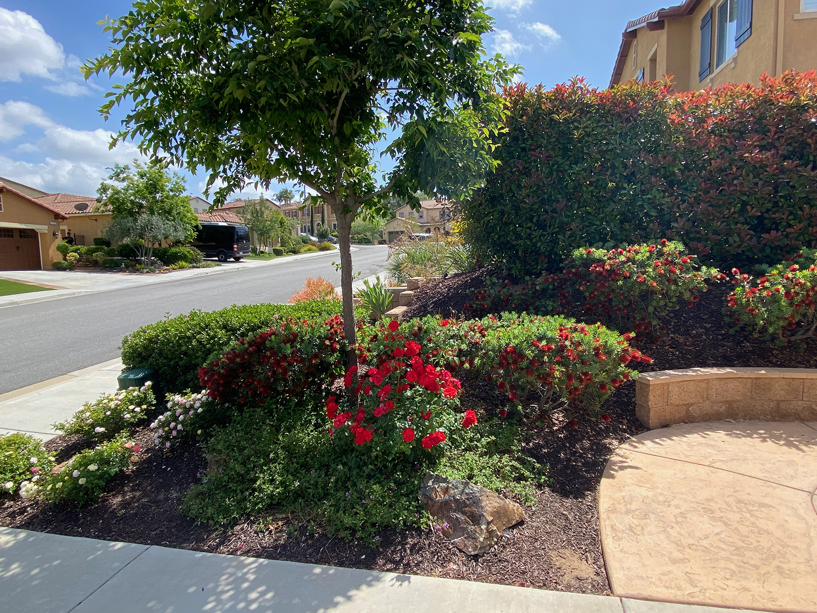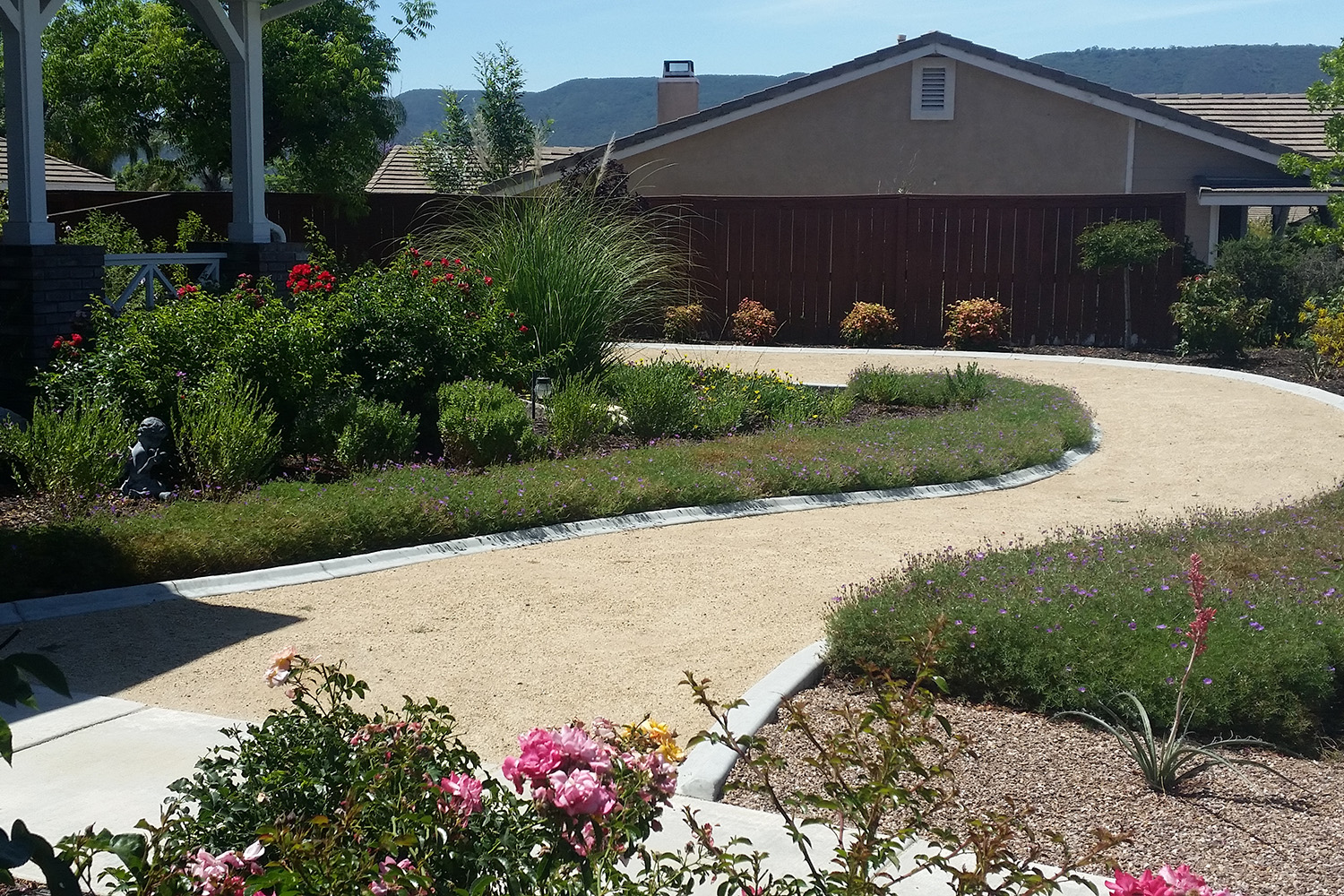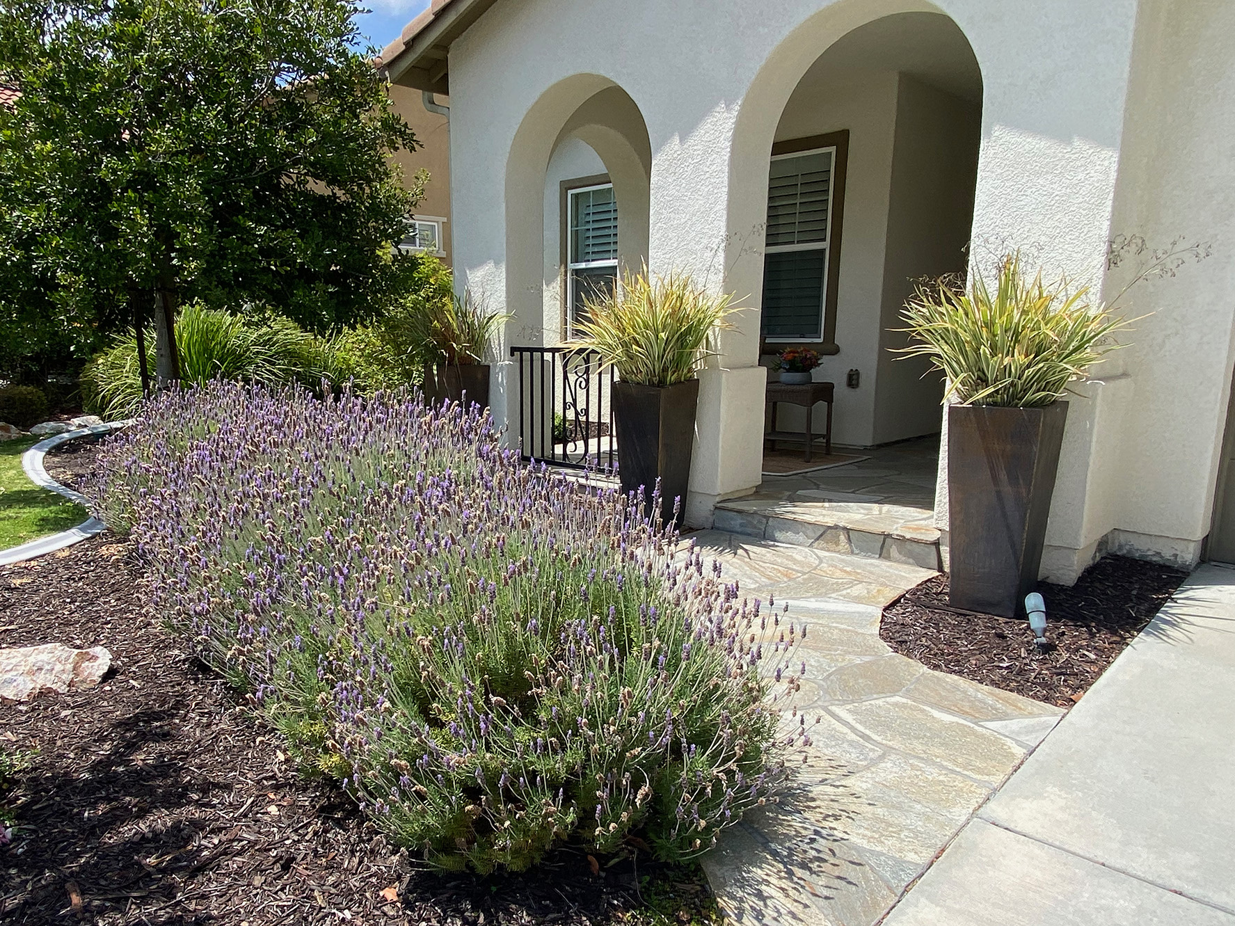 Mediterranean gardens are a bold way to landscape. Bright colors in red, yellow, orange and purple are usually seen. Bold architectural plants are used along with soft ornamental grasses to introduce sound and movement into the garden. Water features and elaborate stonework are a part of some projects. Mediterranean plants are easy to grow in Southern California so this type of landscape is very popular (and successful!).