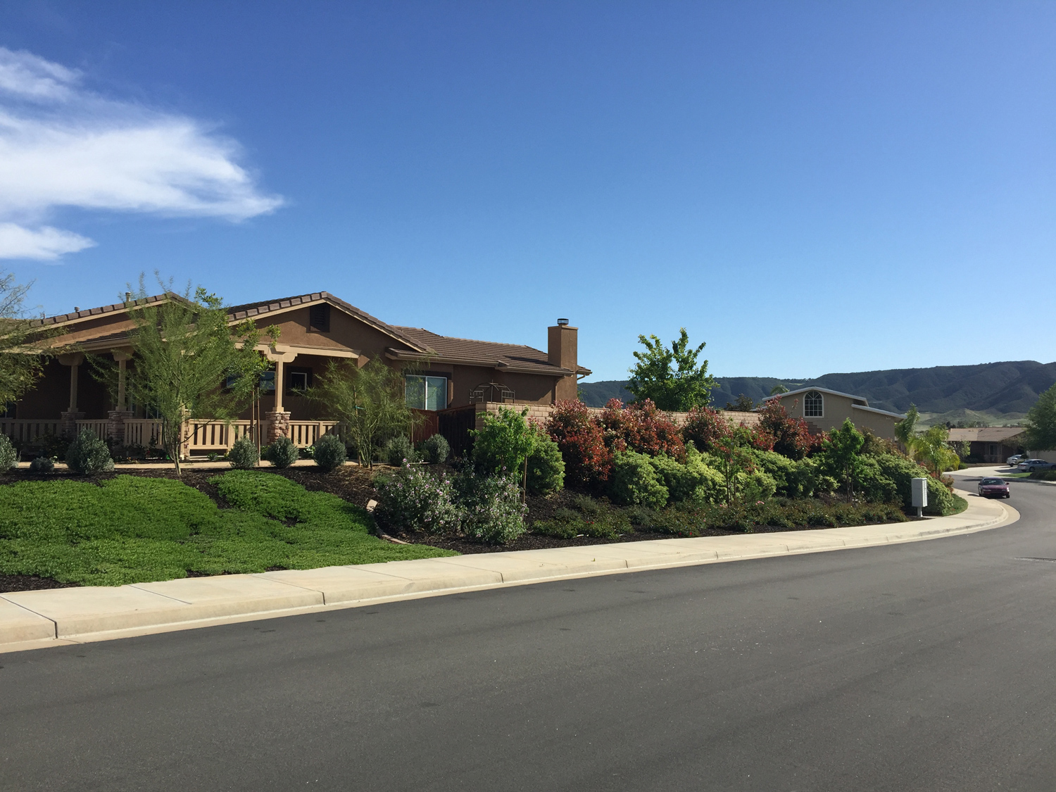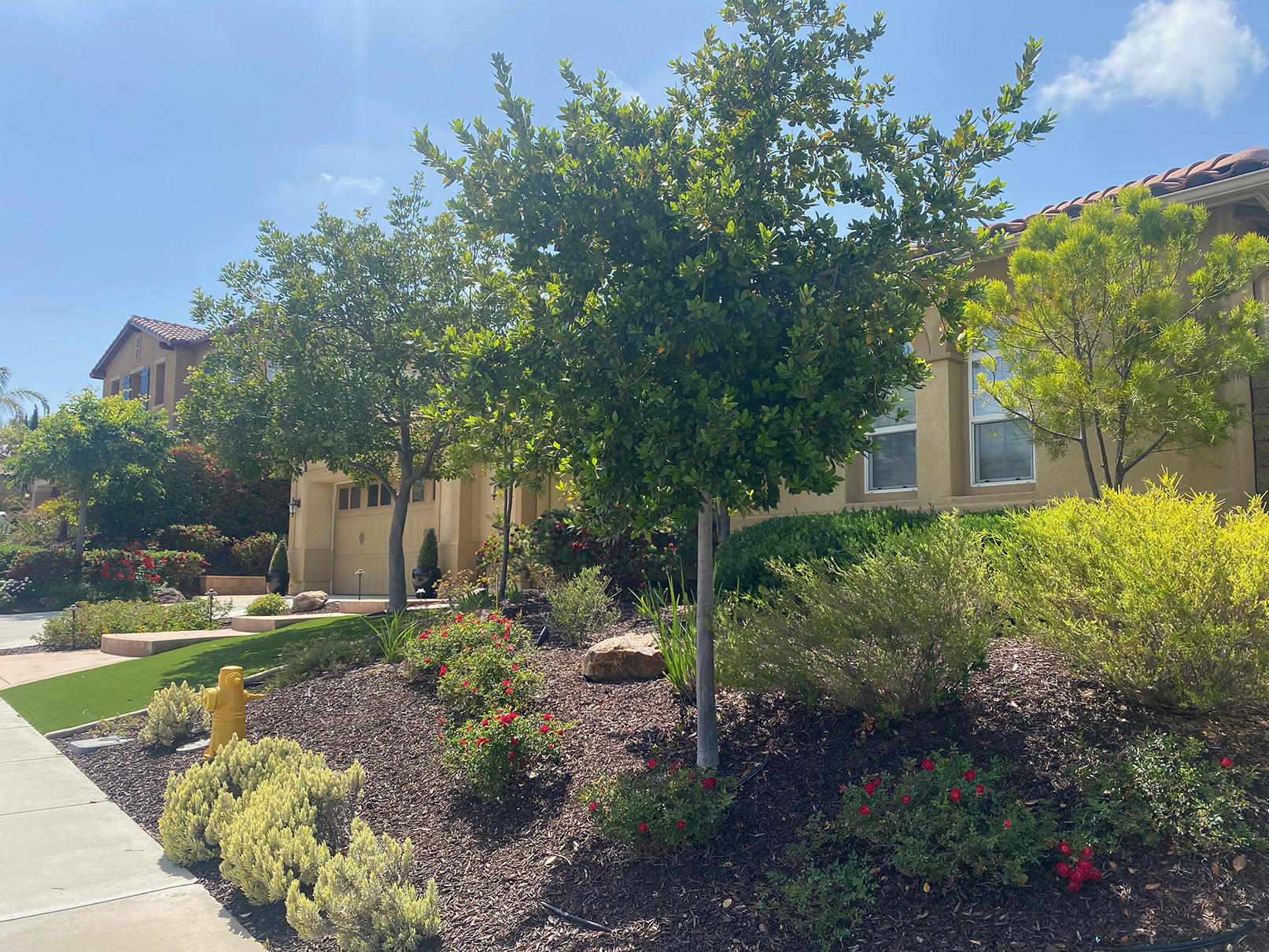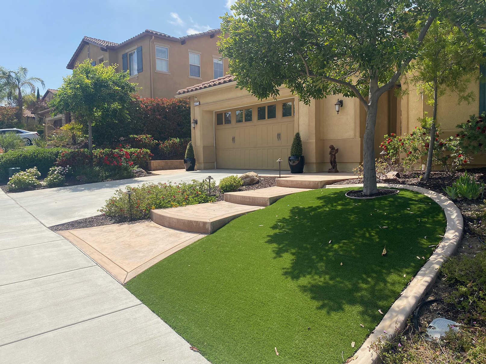 Mediterranean gardens are a bold way to landscape. Bright colors in red, yellow, orange and purple are usually seen. Bold architectural plants are used along with soft ornamental grasses to introduce sound and movement into the garden. Water features and elaborate stonework are a part of some projects. Mediterranean plants are easy to grow in Southern California so this type of landscape is very popular (and successful!).