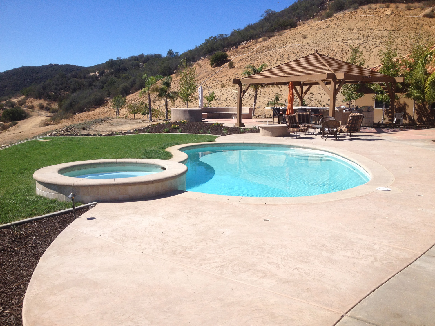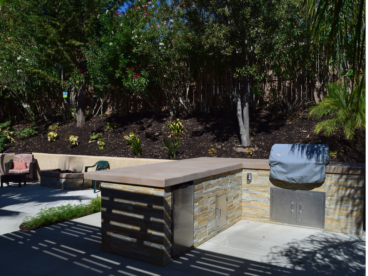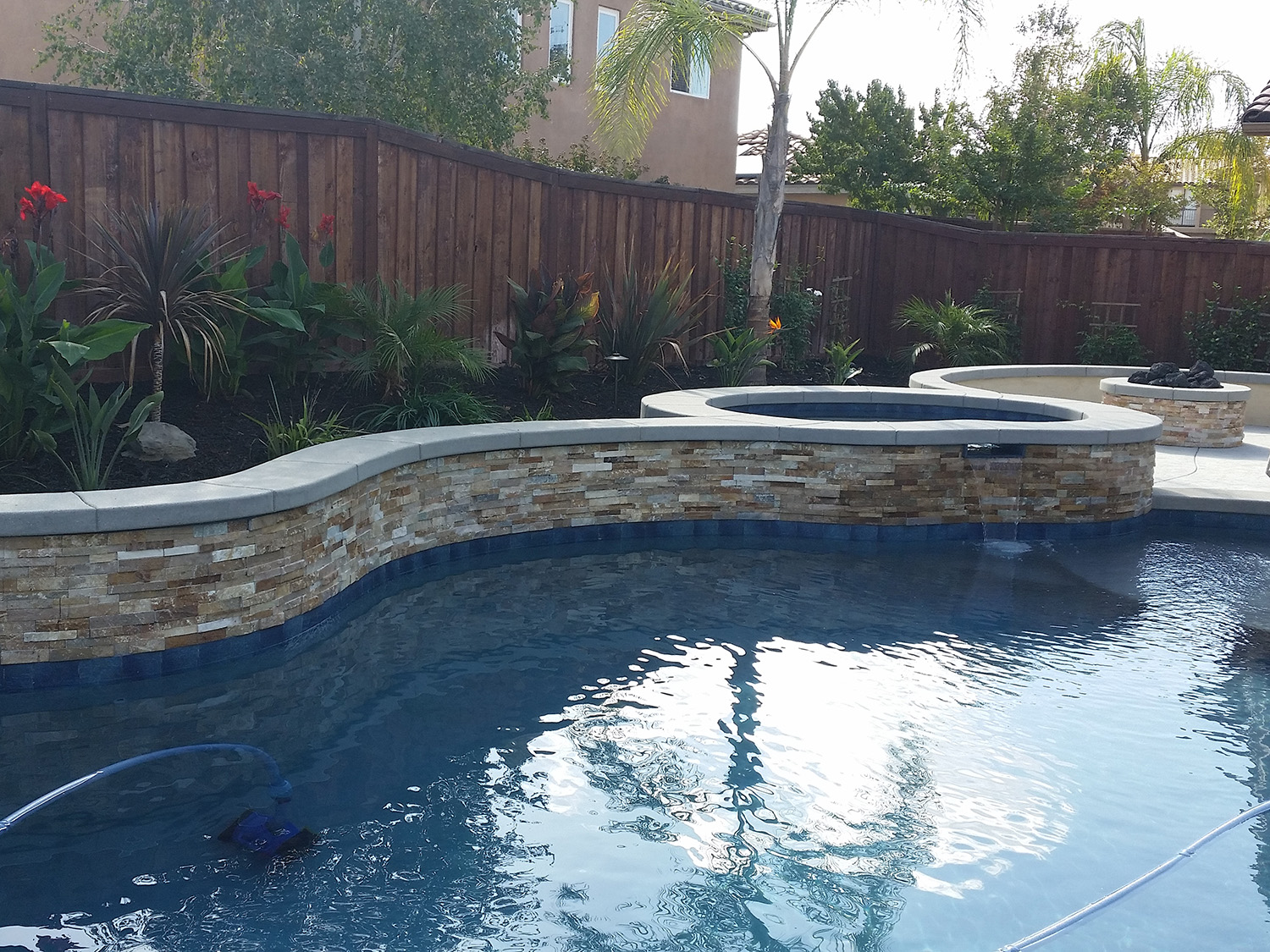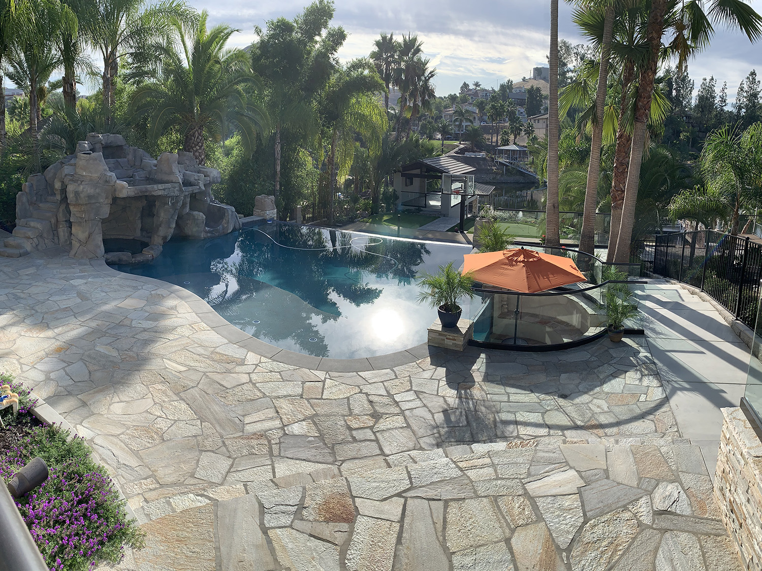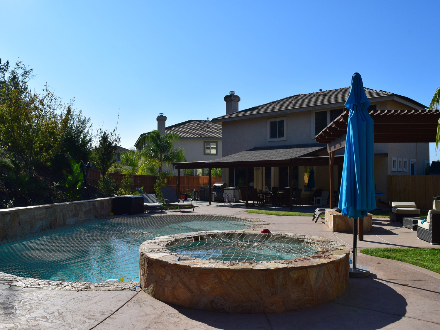 Whether lush and leafy or colorful and bright, tropical landscapes can take transport you to another place without having to leave your own back yard. Shot of pavers paths and live grass areas. Shot of bamboo fencing. Shot of frilly orange flowers. Shot of waterfall/ water slide in pool structure. Shot of stone finished wall curbing. Shot of curbed turf lawn. Shot of pool with water slide, waterfall, infinity edge and shallow step. Shot of concrete pool border. Shot of glass railings on stone finished balcony. Shot of half court and palm trees. Shot of mulch plantings curbed by boulders and glassed in lake house. Shot of basketball court, putting green, artificial turf lawn, flagstone paver path and stairs, glassed in lake/boat house. Shot of pool and spa, fireplace, tropical plantings, stonework Shot of large flowering purple and pink plant blocking the staircase path into the backyard. Shot of dark wooden latticed patio cover. Shot of tan concrete pool and hot tub. Shot of Outdoor kitchen with stone facing in Temecula McCabe’s Landscape Construction Shot of covered pool. Shot of covered flagstone pool and hot tub.