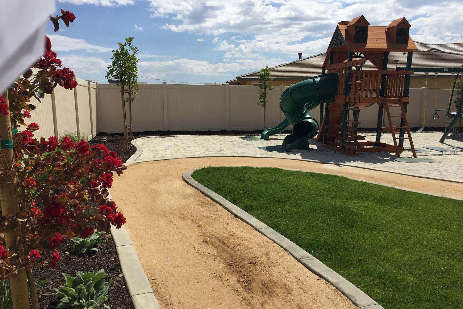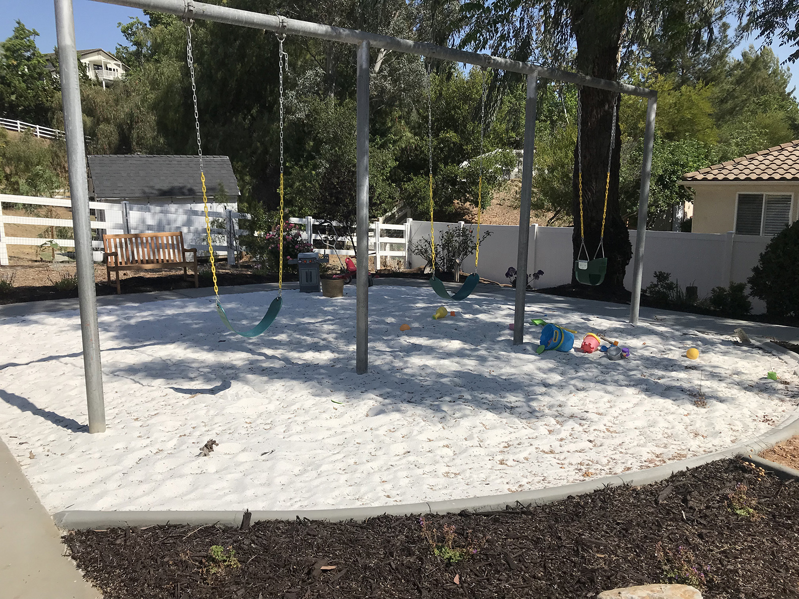 Shot of shaded seating area and curbed sand pit.
