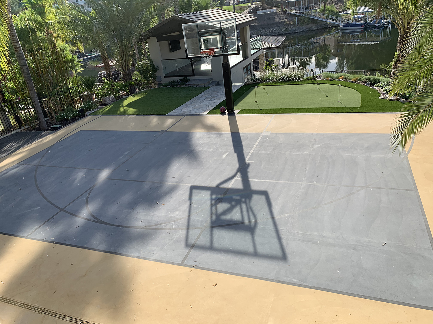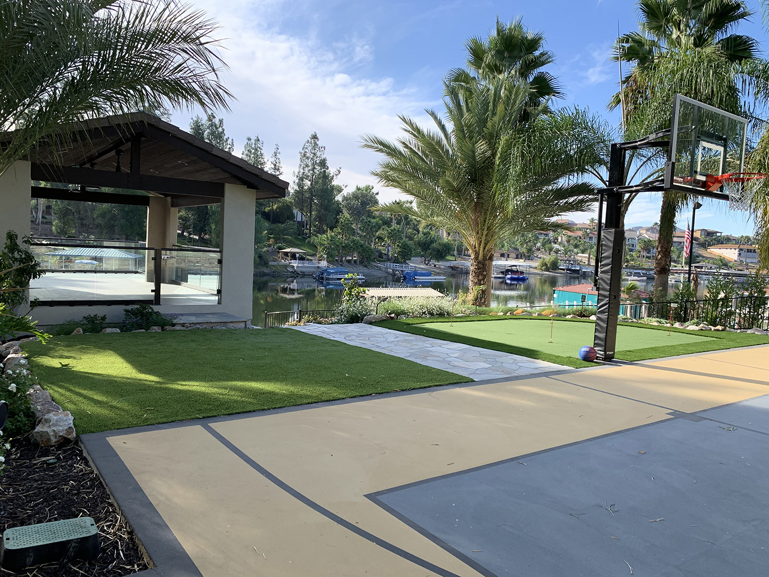 Shot of basketball court, putting green, artificial turf lawn, flagstone paver path and stairs, glassed in lake/boat house.