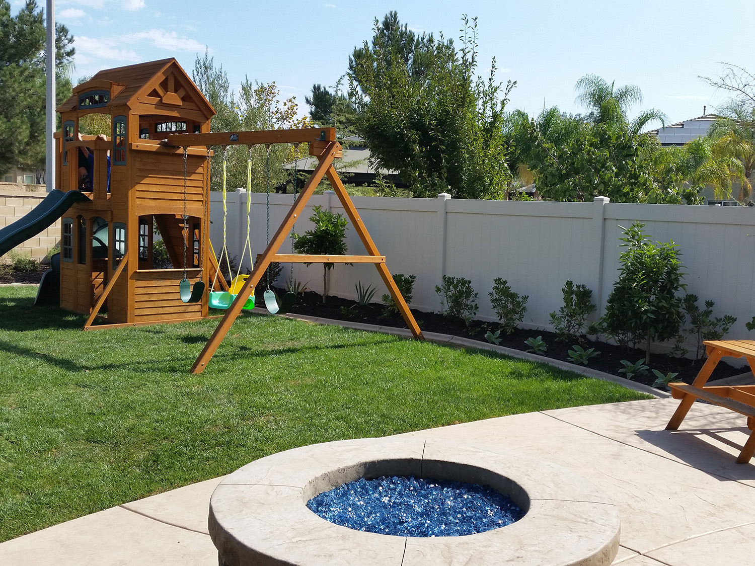 Shot of Family-friendly rear yard (colored and stamped concrete, a fire pit with colorful glass, and grass with a play set)
