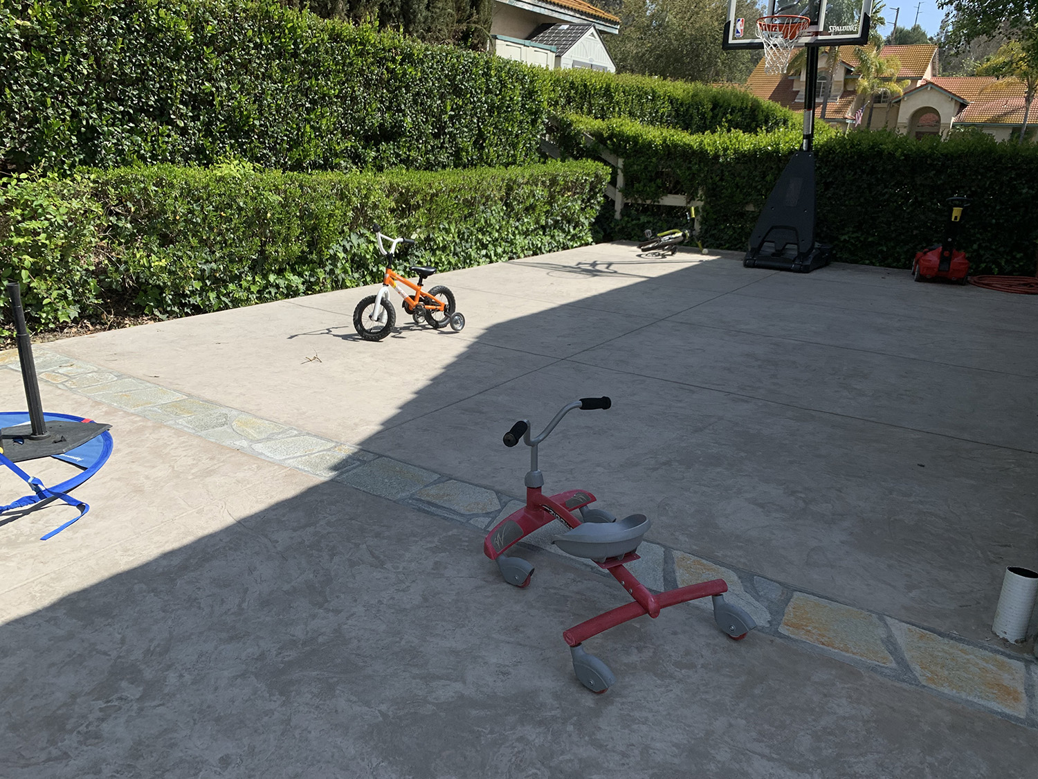 Shot of backyard pool with small child sized basketball hoop.