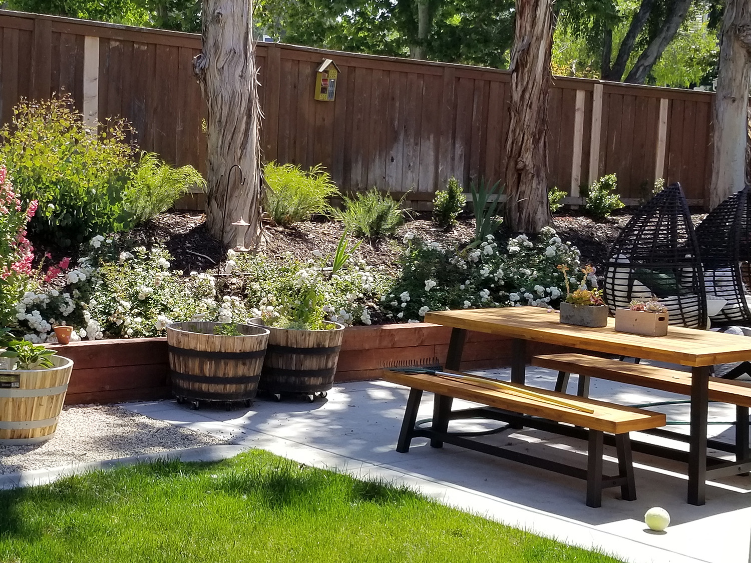 Shot of bench, planters, and egg chairs.