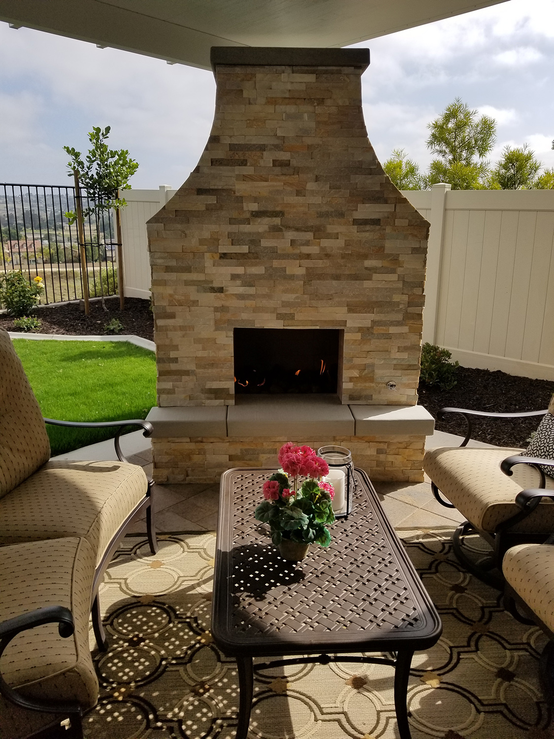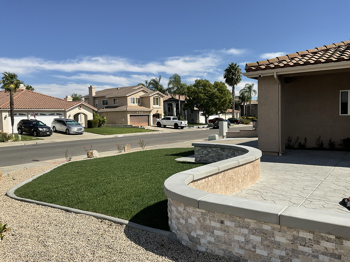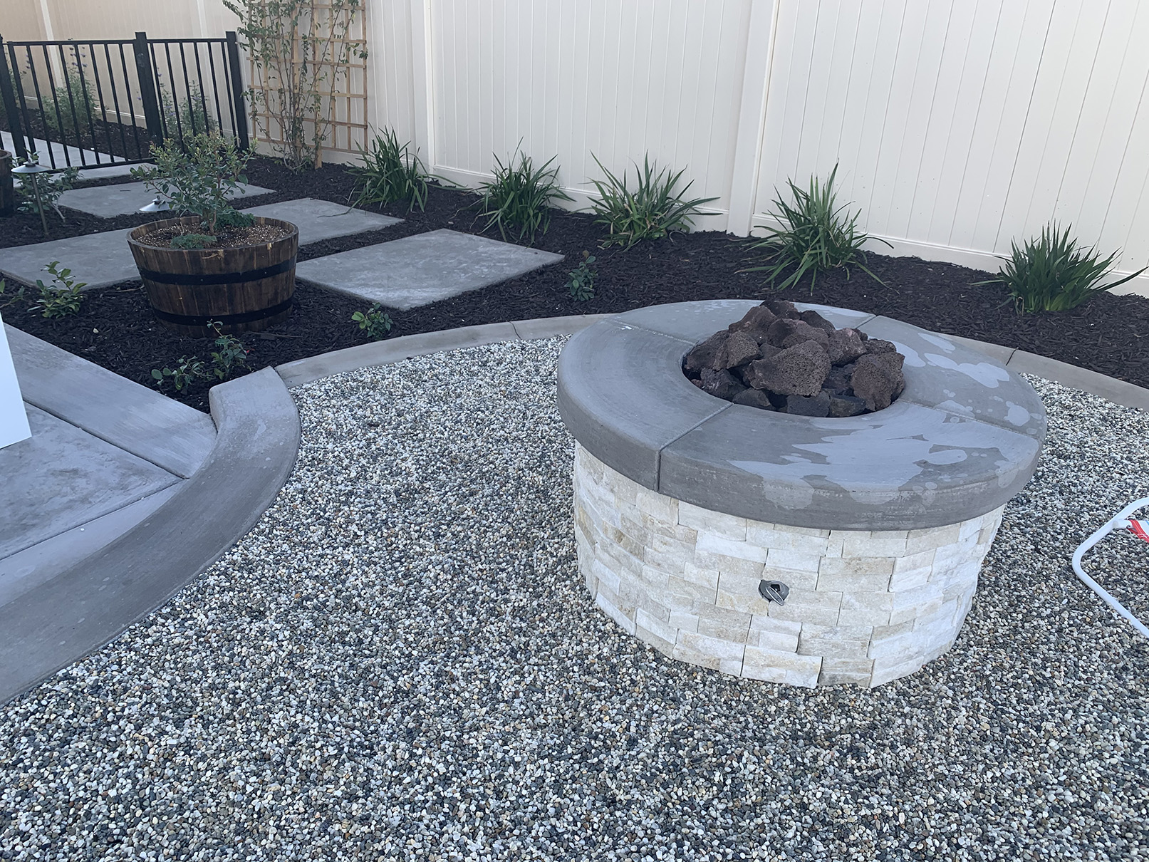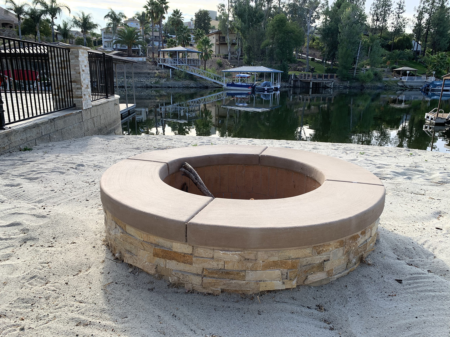 Shot of Colored concrete with flagstone border Oval fire pit with sitting wall and colored concrete in Temecula McCabe’s Landscape Construction
