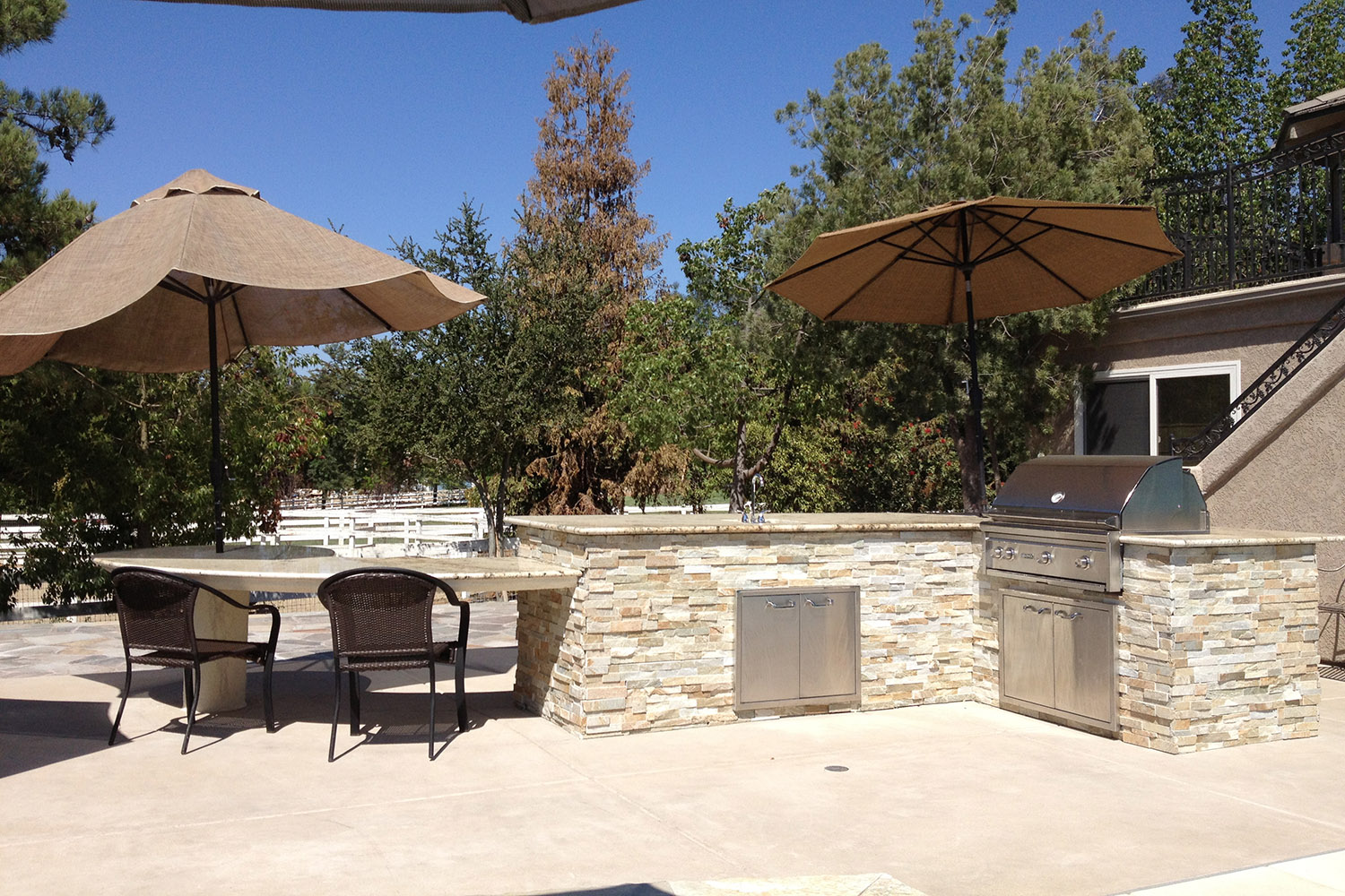 Shot of concrete counter with built in open air barbecue with steel cabinet storage.
