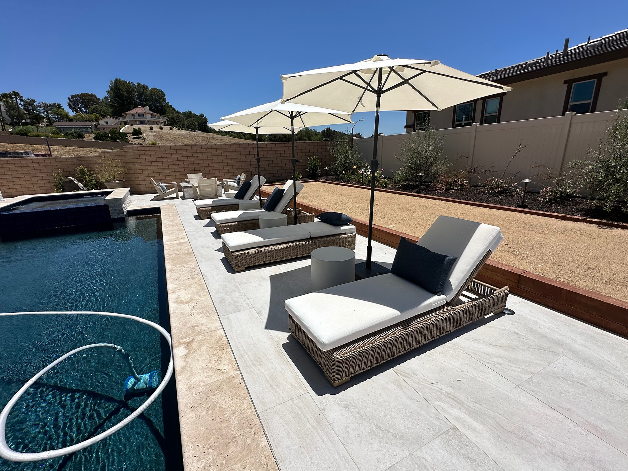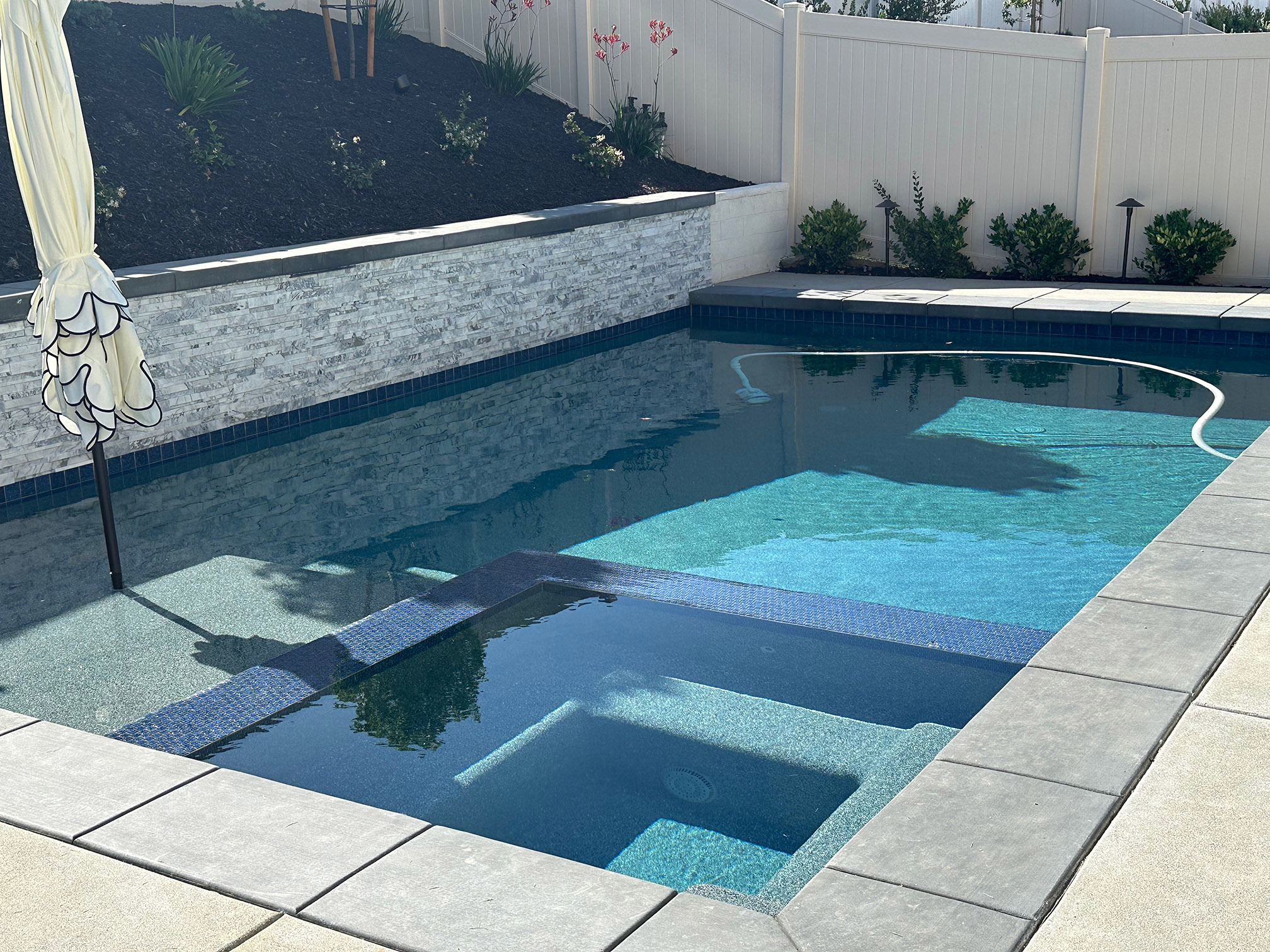 Shot of Modern Pool, Spa, and Pool Deck Seating Area.
